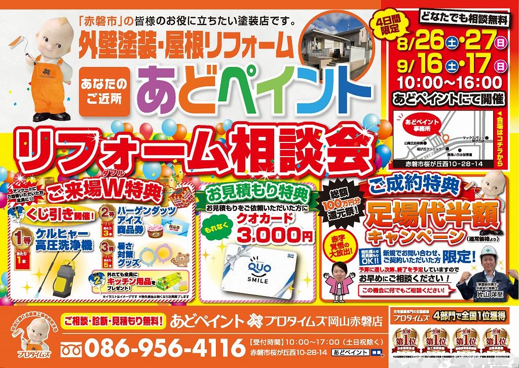 9月27日(土)・28日(日)の2日間限定で、来場・成約された方には豪華抽選&プレゼントをご用意。さらに、今なら「まだ間に合うリフォーム補助金」も活用できる絶好のチャンスです。まずは無料診断からお申し込みください。