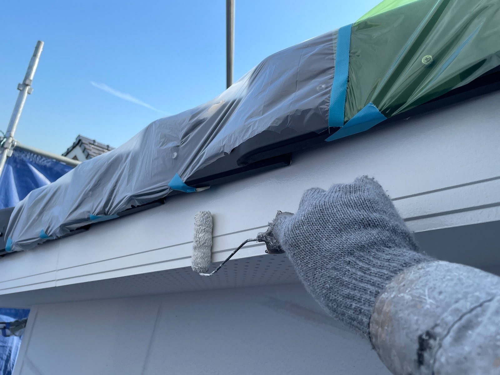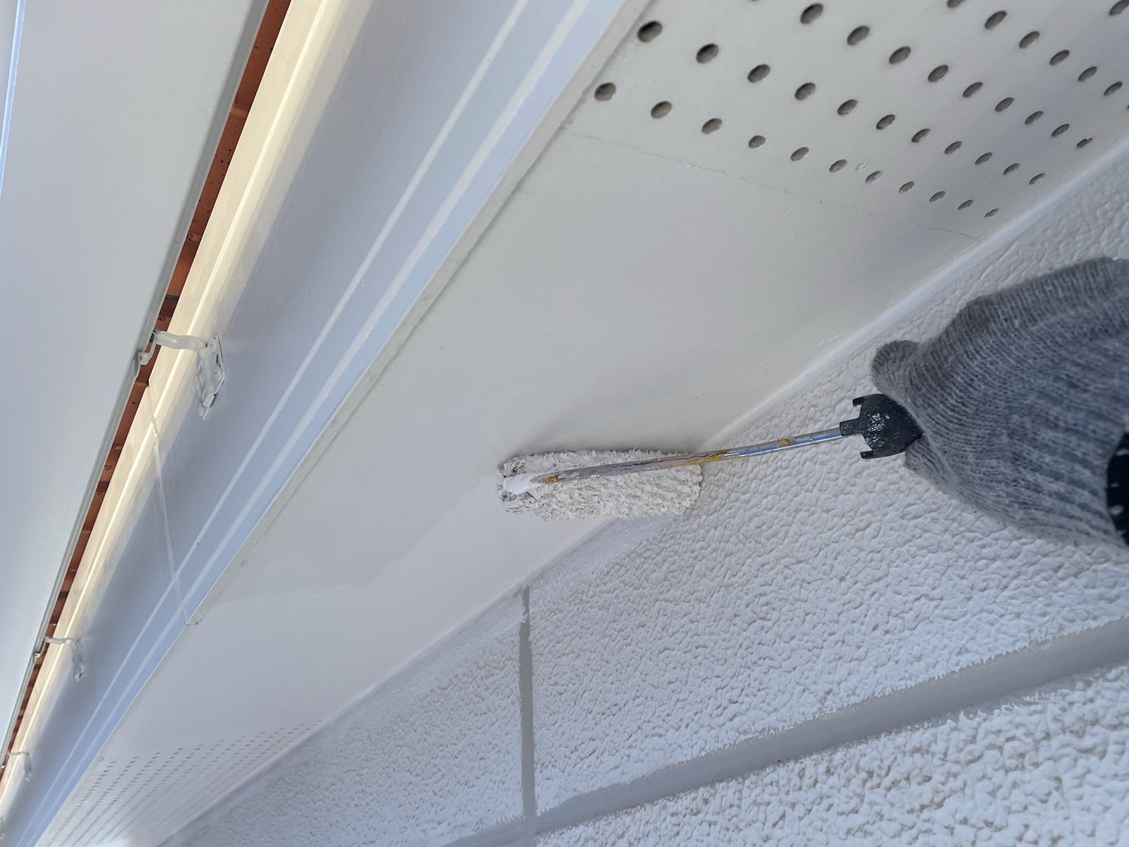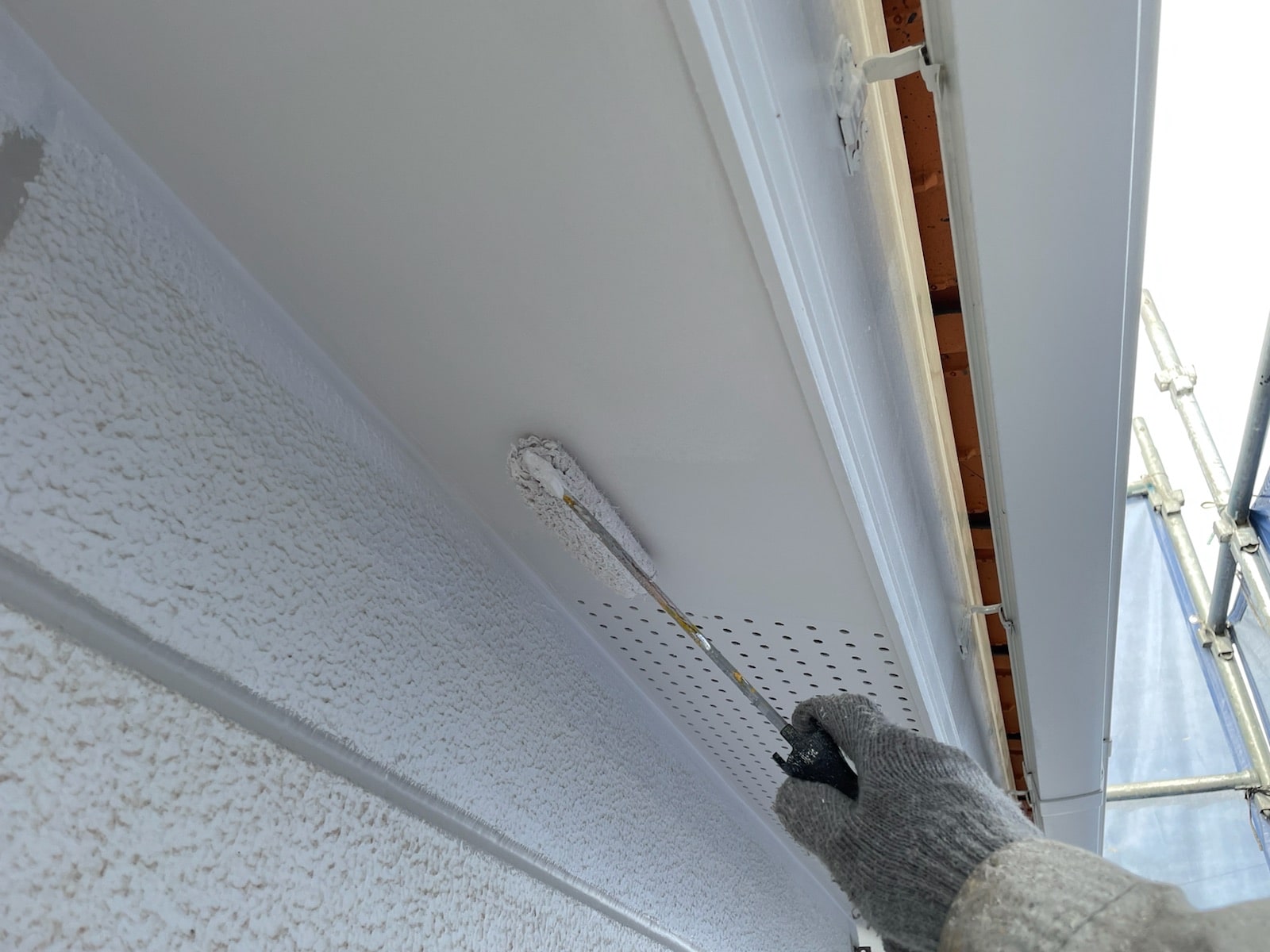 軒天上塗り塗装中